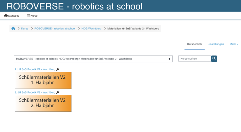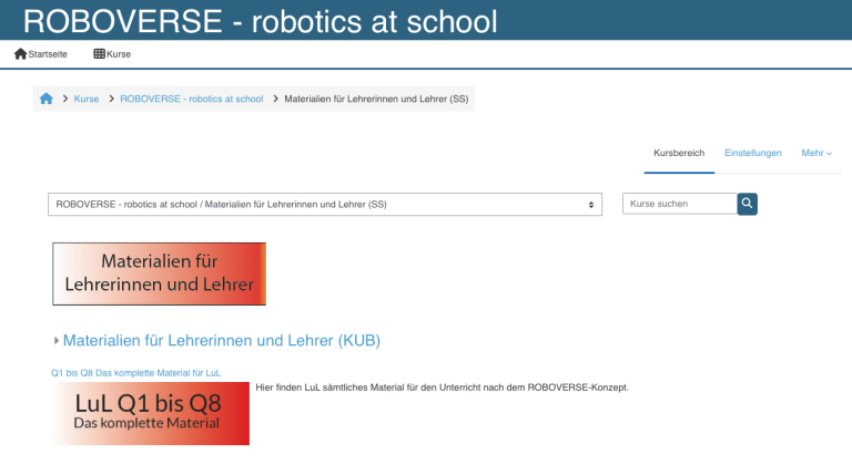 ROBOVERSE stellt umfangreiches Unterrichtsmaterial für Schüler:innen und Lehrer:innen zur Verfügung. Dieses wird ausschließlich online, also digital, nach dem kostenpflichtigen Erwerb eines Lizenzschlüssels auf der Plattform Moodle bereitgestellt. Downloads sind nicht möglich.